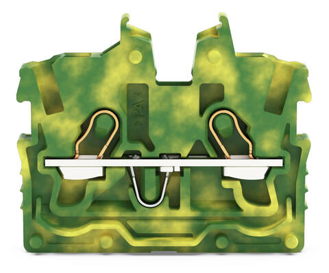 2-проводные миниатюрные проходные клеммы; с рабочими гнёздами; 1 мм²; с тестовым портом; боковая и центральная маркировка; Средние клеммы без монтажной защёлкивающейся ножки и фланцев; Push-in CAGE CLAMP®; 1,00 mm²; зеленые-желто