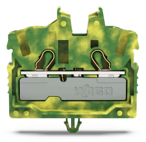 2-проводные миниатюрные проходные клеммы; с рабочими гнёздами; 2,5 мм²; с тестовым портом; боковая и центральная маркировка; с защелкивающейся монтажной ножкой; Push-in CAGE CLAMP®; 2,50 mm²; зеленые-желто