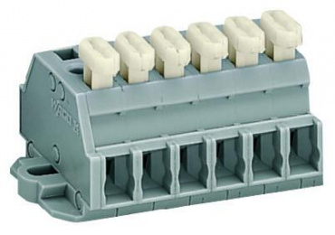 2-проводные клеммные колодки; 6-пол.; с одной стороны с нажимными кнопками; с крепежными фланцами; для винтового или аналогичных типов крепления; Крепежное отверстие 3,2 мм Ø; 2,5 мм²; CAGE CLAMP®; 2,50 mm²; серые
