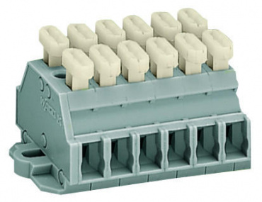 2-проводные клеммные колодки; 6-пол.; с обеих сторон с нажимными кнопками; с крепежными фланцами; для винтового или аналогичных типов крепления; Крепежное отверстие 3,2 мм Ø; 2,5 мм²; CAGE CLAMP®; 2,50 mm²; серые
