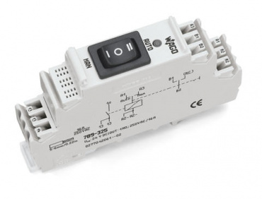 Релейный модуль; Номинальное входное напряжение: 24 В пост. тока; 1 замыкающий контакт; Предельный длительный ток: 16 А; для ламповых нагрузок; Ручное/Выкл/автоматическое выключение; Красный индикатор состояния; Ширина модуля: 18 мм